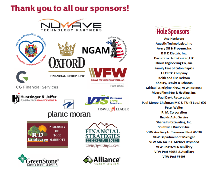 Mike Wilson, Executive Director, was extremely grateful for the support of the community. “What an excellent turn out of partners, veterans, and friends of the VFW National Home. We’re so grateful for all the teams that were able to make it to our outing, our partners who supported the event, and certainly our primary sponsor NUWAVE Technology Partners. We had beautiful weather and a great time with golfers from all around southwest Michigan as well as some new friends from the Medalist Golf Club who joined us. We look forward to next year already, again thanks to all who were able to be with us or supported us in some way.”